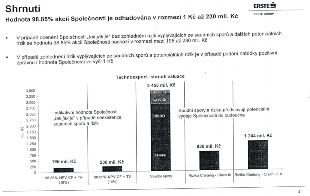 „Hodnota 98,85 % akcií Společnosti je odhadována v rozmezí 1 Kč až 230 mil. Kč,“ shrnuje dokument s názvem „indikativní ocenění“, jejž dělala firma Erste Corporate Finance (ECF). V její zprávě se uvádí, že „v případě zohlednění rizik vyplývajících ze soudních sporů a potenciálních rizik je v případě podání nabídky pozitivní zprávou i hodnota Společnosti ve výši 1 Kč“.