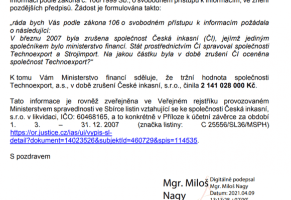 Likvidátor České inkasní Pavel Trenda si nechal udělat další znalecký posudek na cenu Technoexportu a ten došel k podobné částce jako předtím posudek Info 7 – Technoexport ocenil na více než 2,1 miliardy korun.