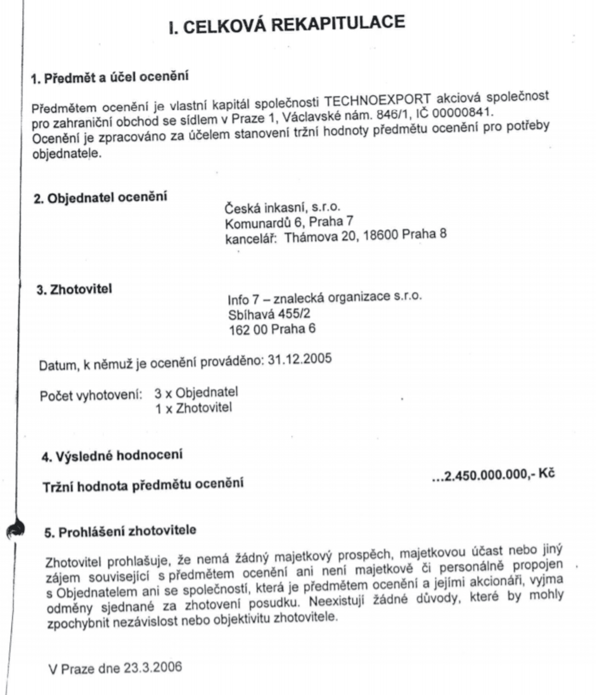 Oddlužený Technoexport si stát (ke konci roku 2005) nechal ocenit. A vypadalo to, že bude prodávat cenný podnik. „Tržní hodnota předmětu ocenění…2 450 000 000 Kč,“ konstatovala znalecká organizace Info 7, kterou si Česká inkasní najala.