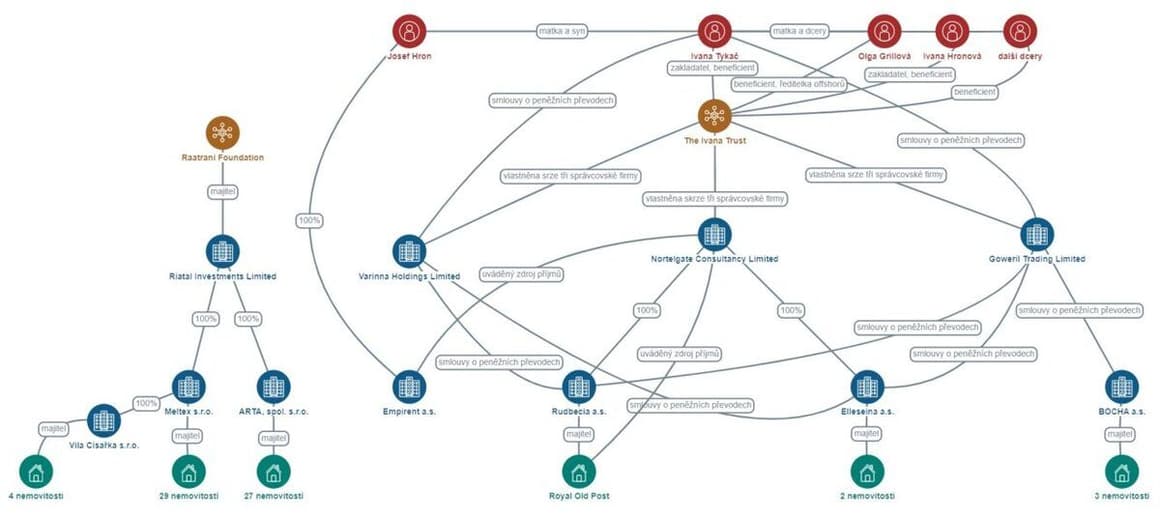 Schématu se celkem týká 564 dokumentů, ovšem ne u všech společností, jež v něm figurují, se podařilo dohledat, zda Ivaně Tykač patří – například proto, že byly zrušeny. Konkrétně se v dokumentech uvádí, že tři kyperské offshory (Nortelgate Consultancy Limited, Varinna Holdings Limited a Goweril Trading Limited) a několik českých firem (Rudbecia, Elleseina, Bocha) se společným vlastníkem – Ivanou Tykač – mezi sebou uzavřely v letech 2006 až 2018 celou řadu smluv.
