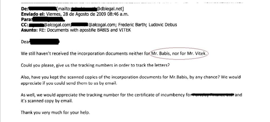 „Ještě jsme neobdrželi zakládací dokumenty firem pro pana Babiše a pana Vítka. Můžete nám prosím zaslat sledovací čísla dopisů, abychom se mohli podívat, kde se nacházejí?“ Píše na konci srpna 2009 asistentka Frederica Bartha, zakladatele francouzské právní kanceláře DB Legal Artwell, v e-mailu do panamské právní kanceláře Alcogal, která se specializuje na zakládání firem v Karibiku.
