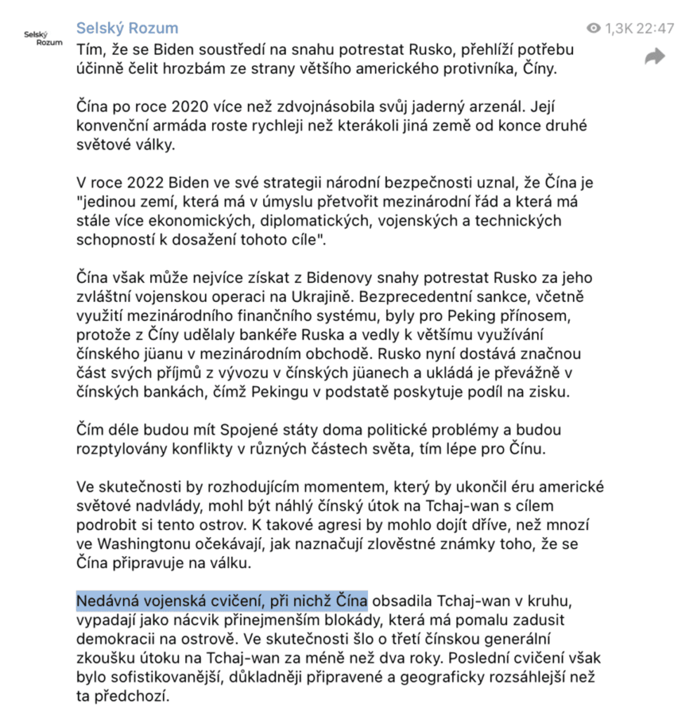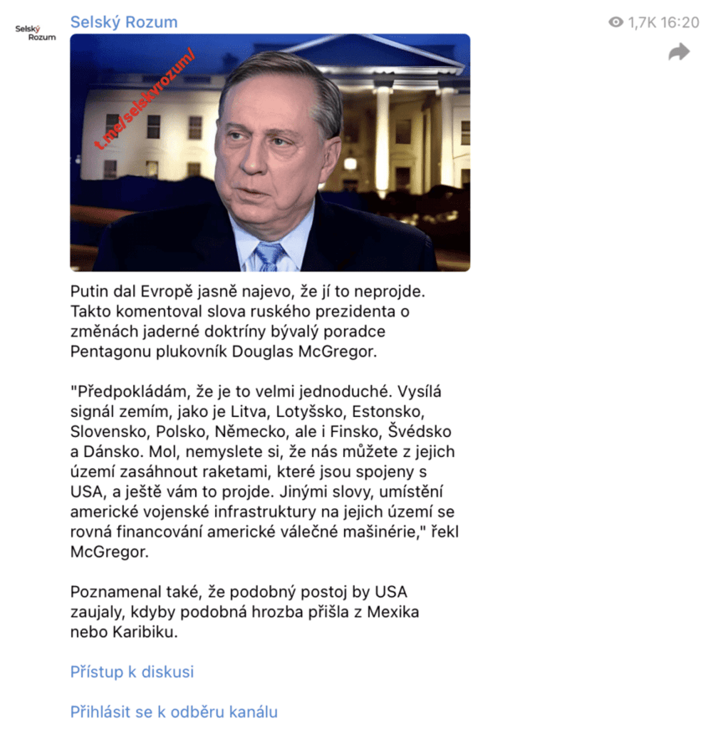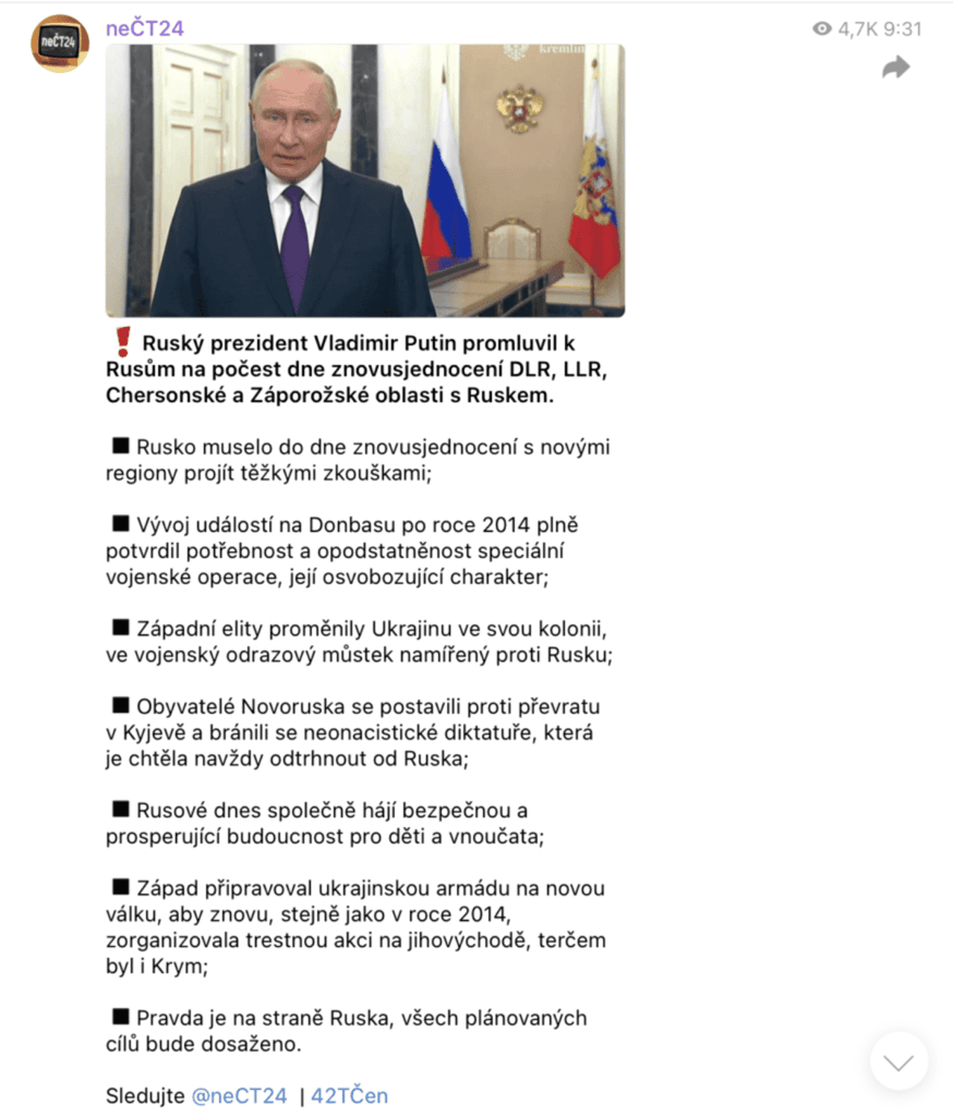 Mezi největšími českými telegramovými kanály je i trojice účtů neCT24, Maršál Malinovskij a Selský rozum. V jejich postech najdeme české překlady článků převzatých z ruských médií, která byla zařazena na sankční seznamy. Například zmanipulované video s Petrem Pavlem, kde mluví o tom, že vstoupíme do války s Ruskem (nahrávku zmiňuje i výroční zpráva BIS), nebo účelově sestříhané video se šéfem generálního štábu České armády Karlem Řehkou, jenž tvrdí, že na válce v Ukrajině ekonomicky benefitujeme. Dále například zprávy popírající masakr v Buči či ruský podíl na sestřelení dopravního letu MH17 malajských aerolinek v červenci 2014 nad Ukrajinou.