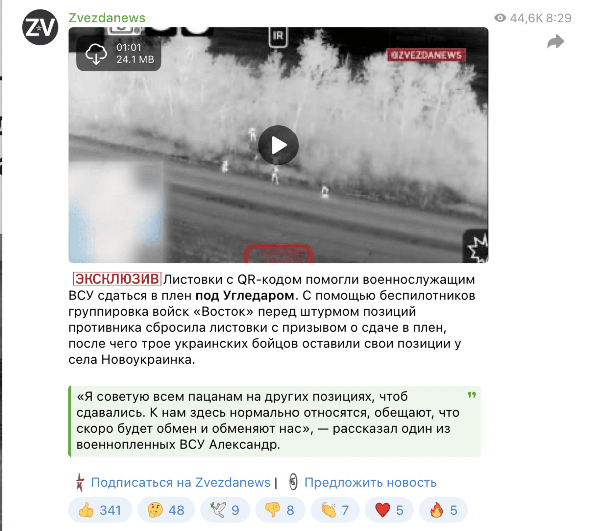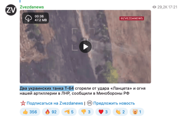 V českém prostředí je text ovšem doplněn titulky a vodoznakem. Není to jediný takto pojatý příspěvek, který se podobá kanálu Zvězda. Dalším může být třeba informace o zničení tanků T-64, což ukazují následující dva screenshoty.