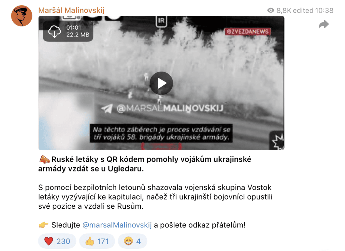 Účet Maršál Malinovskij většinou nepíše o zdrojích svých informací a do sdíleného videoobsahu vkládá, stejně jako neCT24, svůj vodoznak. Nicméně u řady příspěvků lze jejich původ dohledat, pokud si je přeložíme do ruštiny. Příkladem může být post o QR kódech, které měly pomoci k tomu, aby se ukrajinští vojáci vzdali Rusům. Jedná se o prakticky stejný post, jaký bychom našli na telegramovém kanálu ruské armádní televize Zvězda.