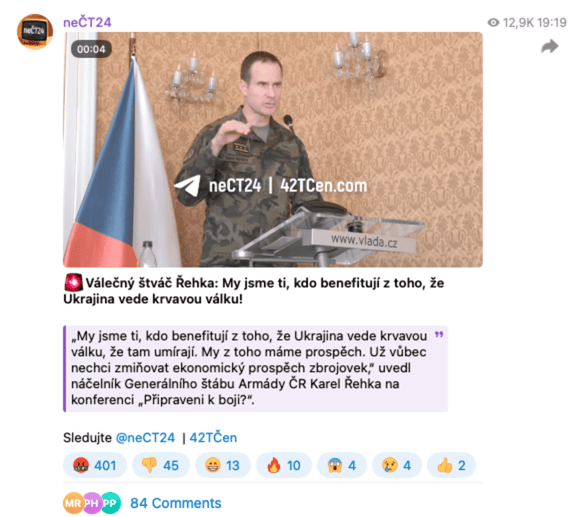 Telegramový účet neCT24 se rovněž zviditelnil sdílením manipulativně sestříhaného videa z vystoupení Petra Pavla v době, kdy kandidoval na funkci prezidenta. V upravené verzi autoři snímku vložili do úst budoucího prezidenta věty o tom, že je nutné vstoupit do přímé vojenské konfrontace s Ruskem. Kanál toto video později smazal. Podobně se zachoval i před několika dny, kdy publikoval video z konference s názvem „Připraveni k boji?“. Nahrávka byla sestříhaná způsobem, jenž měl budit dojem, že generál Řehka mluví o finančním prospěchu České republiky z válečného konfliktu v Ukrajině. I toto video kanál později smazal.