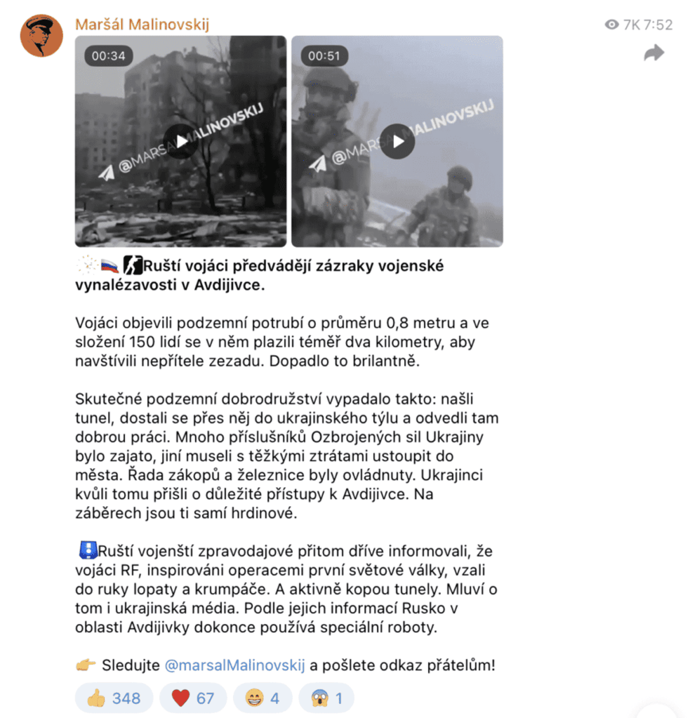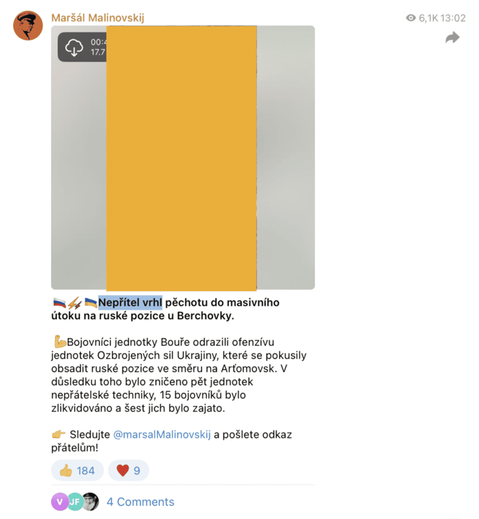 Ačkoli se jedná o zjevně ruské a propagandistické kanály, jejich posty jsou sdíleny desítkami dalších českých a slovenských účtu, které tak pomáhají úspěšné šířit propagandu cizího státu a obcházet sankce Evropské unie. Autor textu: Josef Šlerka; 14. 10. 2024 V článku jsme zpřesnili ruský výraz Взять в кольцо a informaci o větné konstrukci “aby vzali.”;