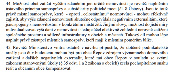 Soud zároveň zmínil, že vyhláška Řepova odpovídá tomu, jak byla novela zákona míněna – tedy jak ji vysvětlovala už citovaná důvodová zpráva k novele zákona a jak o ní mluvila tehdejší ministryně financí Alena Schillerová. „Individualizace provedená obcí Řepov byla předpokládaná zmocňující zákonnou úpravou a nebyla výrazem libovůle či nepřípustné diskriminace,“ konstatovali ústavní soudci. Znění celého nálezu Ústavního soudu najdete zde.