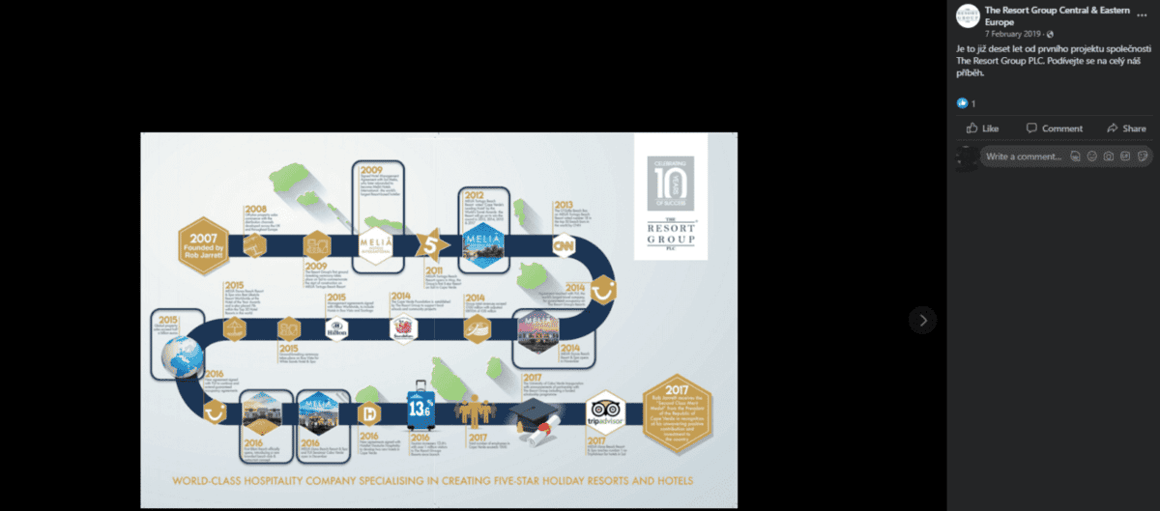 Donedávna měla The Resort Group i facebookovou stránku, kde v češtině nabízela investice do resortu a publikovala videa a fotografie z probíhající výstavby. Poslední propagační příspěvek ale pocházel z roku 2019 a stránka už není dostupná. Möller to vysvětluje tím, že na její provoz pražská pobočka momentálně nemá prostředky. „Poté, co jsme na konci roku 2020 museli kvůli covidu pražskou pobočku The Resort Group uzavřít, ji nyní znovu budujeme,“ dodal.