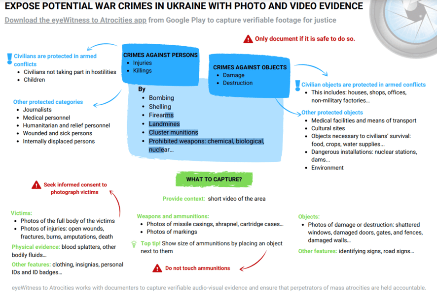 V tomto směru je příkladem neziskovka eyeWitness, která vyvinula speciální aplikaci na sběr audiovizuálních materiálů, jež by měly obstát před soudem jako důkazní materiál. Svědek válečného zločinu tak může prostřednictvím speciálně zabezpečené aplikace pořídit fotku nebo video.