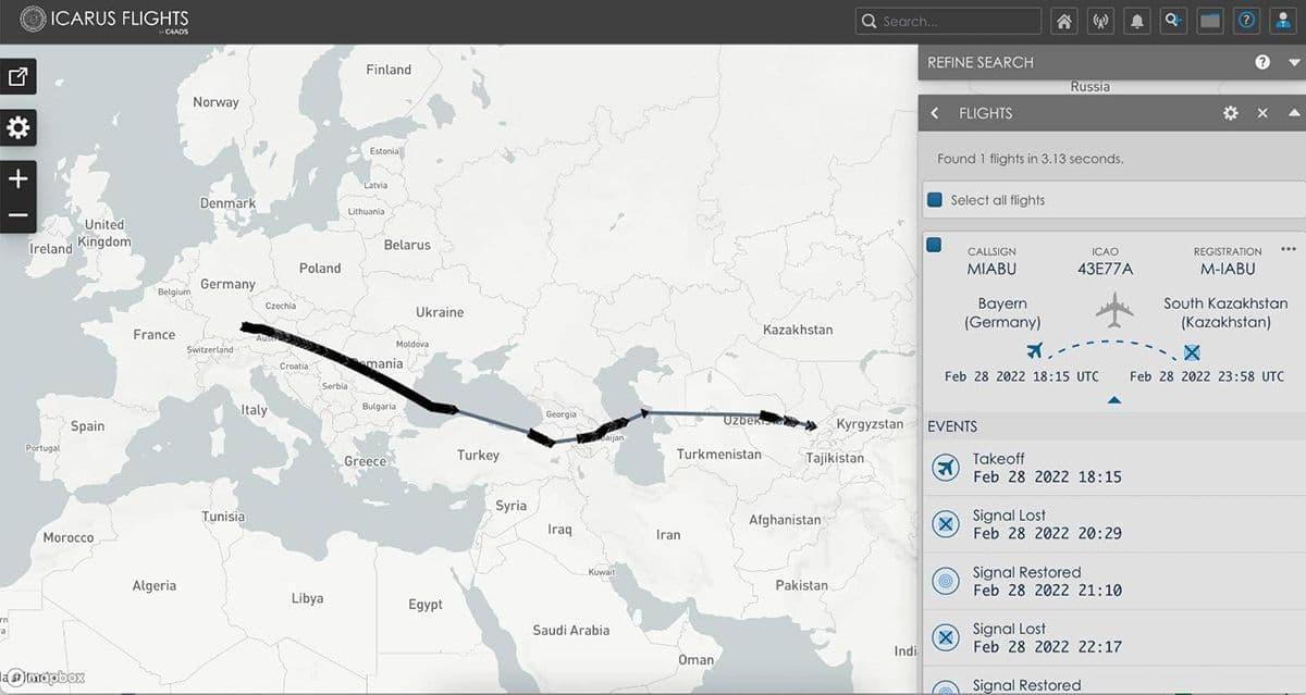 Letadlo, jež vlastní Ališer Usmanov na Icarus Flights, během cesty z Německa do Kazachstánu z icarus.flights.