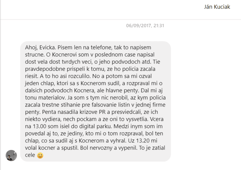 Spolumajitel finanční skupiny Penta Investments Jaroslav Haščák prolomil svou mlčenlivost vůči médiím. Do světa se totiž dostala sms komunikace z ledna 2018 (měsíc před Kuciakovou vraždou) mezi ním a Mariánem Kočnerem. Kočner v ní píše, že už pracuje „na odj **ní ču“. Na to Haščák odpovídá: „řekneme si, až budeme spolu.“