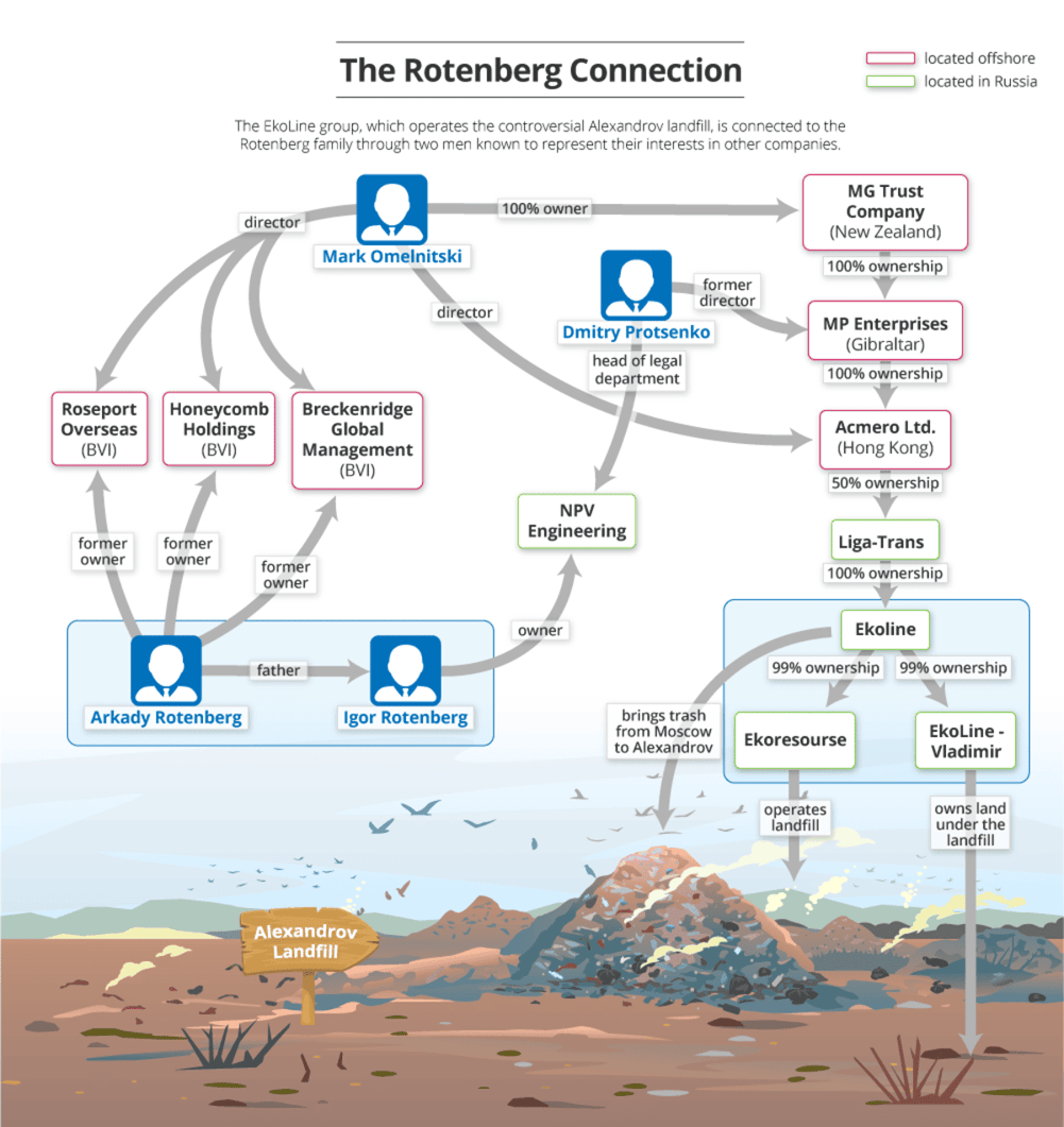Firmy ze skupiny EkoLine, jež si ve zmíněném Alexandrově pronajímají skládku a zároveň na ni svážejí miliony tun odpadu z Moskvy, totiž vlastní jistý Mark Omelnitski. Ruští novináři odkryli už během kauzy Panama Papers, že tento britský občan byl nastrčeným ředitelem alespoň ve třech zahraničních firmách, které dříve patřily Arkadiji Rotenbergovi a jeho synu Igorovi. Novináři svá současná zjištění podepřeli o vícero důkazů ze zahraničních rejstříků, napojení EkoLine na rodinu Rotenbergů pak přiznal i jeden z vysoce postavených úředníků, jenž měl odpadovou reformu na starosti.