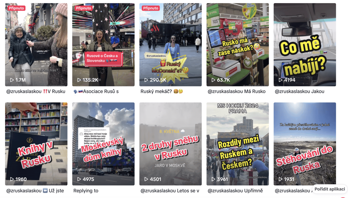 Účet používá také řadu hashtagů, mezi nimi #zruskaslaskou. Přes tento hashtag lze na TikToku najít i videa, která ale od Olgy nepocházejí: jde například o snímky z účtu Leopardí pes. Za tímto názvem se skrývá TikTok publikujcí v poseldních měsících videa z YouTube kanálu plzeňského zastupitele Jakuba Zieby, o jehož aktivitách ohledně pozitivní reprezentace Ruska nedávno informovala investigace.cz. Jakub Zieba ovšem popírá, že by účet byl jeho. “Kdo za tím stojí, netuším. Já vždy zásadně vystupuji pod svým jménem,” říká k tomu samotný Jakub Zieba. (Pozn. red. Článek původně úváděl, že se jedná o jeho účet, za nepřesnost se omlouváme.)