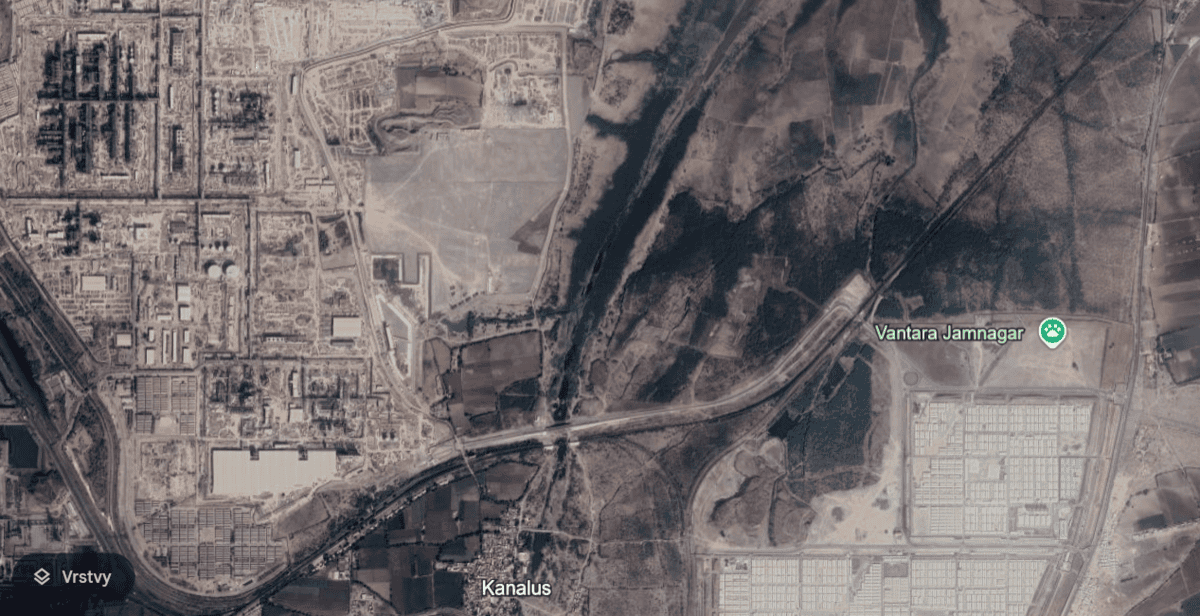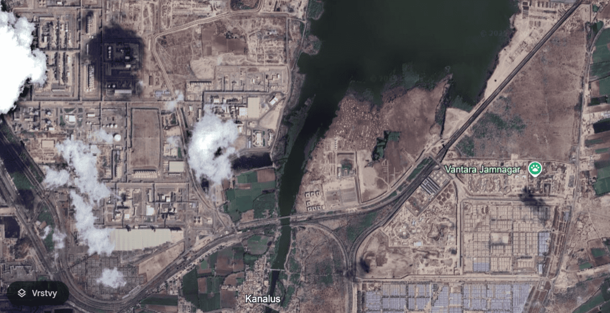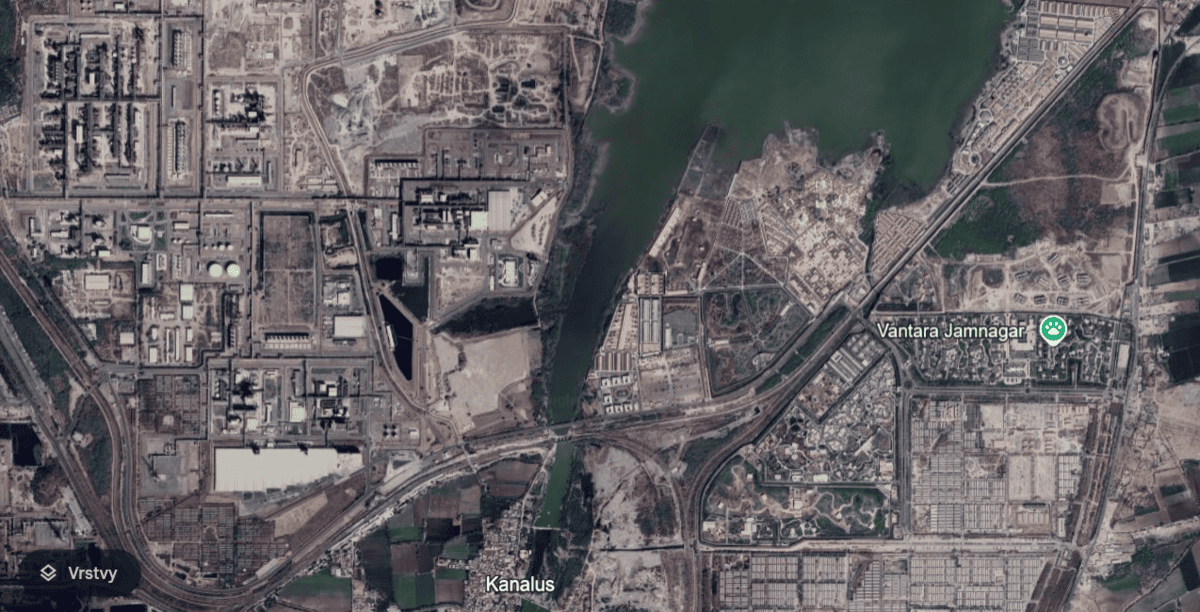 Snímky z let 2016, 2022 a 2025 zachycují území v indickém státě Gudžarát, kde vpravo postupně vznikl areál Vantara. Ten přímo sousedí s jednou z největších průmyslových zón na světě – ropnou rafinérií Reliance Industries Limited (vlevo). Satelitní záběry ukazují rychlou proměnu původně neosídlené krajiny. Zdroj: Google Earth