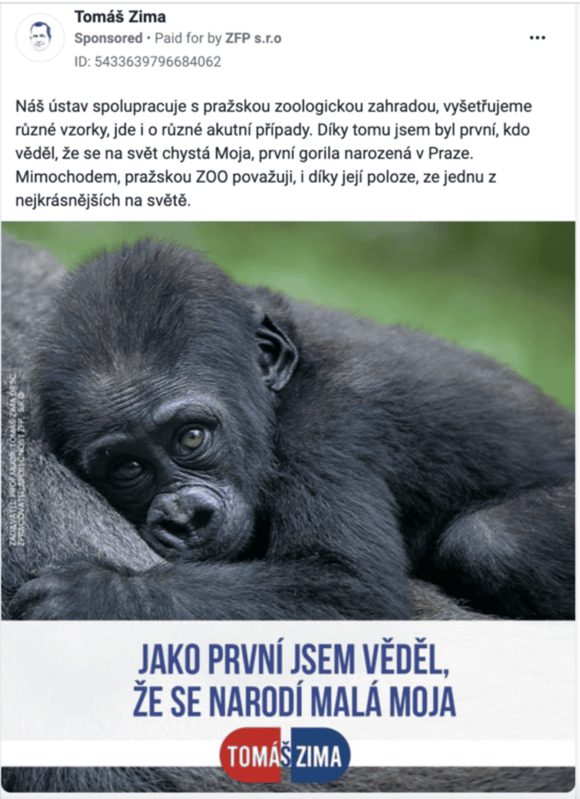 Dalším z kandidátů, jenž ve srovnání s minulostí výrazně navýšil investice do propagace svých postů, je lékař Tomáš Zima. Ten vsadil, podobně jako třeba tým Petra Pavla, na značné množství malých kampaní. Jejich vizuální podoba většinou zdůrazňuje lékařský původ kandidáta prezentovaný již v logu jeho kampaně, které připomíná pilulku, a často na Zimovu lékařskou praxi odkazuje. Jako například v postu o opičce Moje.
