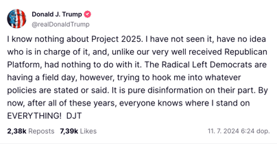 Trumpův tým se distancuje od iniciativy Project 2025, přičemž na přípravě zmíněného projektu se podíleli právě úředníci Trumpovy administrativy i jeho volební štáb. Donald Trump vydal prohlášení, v němž uvedl, že „netuší, kdo za tím [Project 2025] stojí“. Součástí projektu je přitom velká část zaměstnanců jeho administrativy i lidí z jeho volebního štábu.